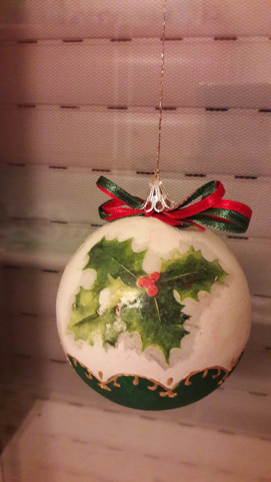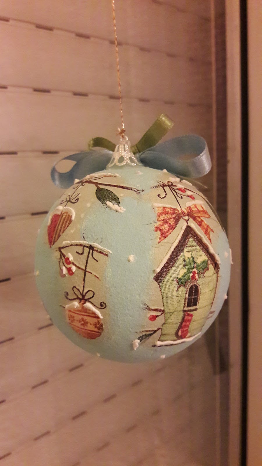 Az utolsó gömbön a szalvétát felragasztás után jégkék akrilfestékkel és szivacsecsettel körbepamacsoltam, majd a minták bizonyos részeit hótollal emeltem ki, ami kissé térbeli hatást kölcsönöz neki.