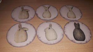 Az elkészítése igazán nem bonyolult. 2 réteg mandulaszínű Dekor Paint Softtal lefestettem a kerek lapokat. A szalvétából kivágott nyuszikat matt dekupázsragasztóval ragasztottam fel mindkét oldalra. A lapokat körben vintage barna Dekor Paint Softtal, szivacsecset segítségével körbepamacsoltam.